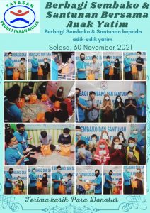 Alhamdulillaah Wa Syukurillaah, puji syukur kita panjatkan kehadirat Allah Subhanahu Wata’ala karena atas rahmat dan karuniaNya acara *Berbagi Sembako dan Santunan Bersama Anak Yatim* pada hari Selasa, 30 November 2021 berlangsung lancar dengan turut melakukan protokol kesehatan
