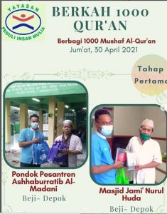 Alhamdulillah, Kegiatan Berkah 1000 Qur’an telah disalurkan ke Mushollah Al Hikmah, Mushollah Al Abror, Para Santri Yatim Yayasan Berkah Sejahtera,