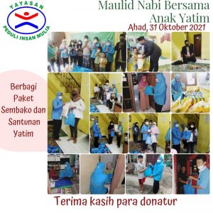 Alhamdulillaah Wa Syukurillaah, puji syukur kehadirat Allah Subhanahu Wata’ala karena atas rahmat dan karuniaNya acara *Maulid Nabi Bersama Anak Yatim* pada hari Ahad, 31 Oktober 2021 berlangsung lancar dengan turut melakukan protokol kesehatan.